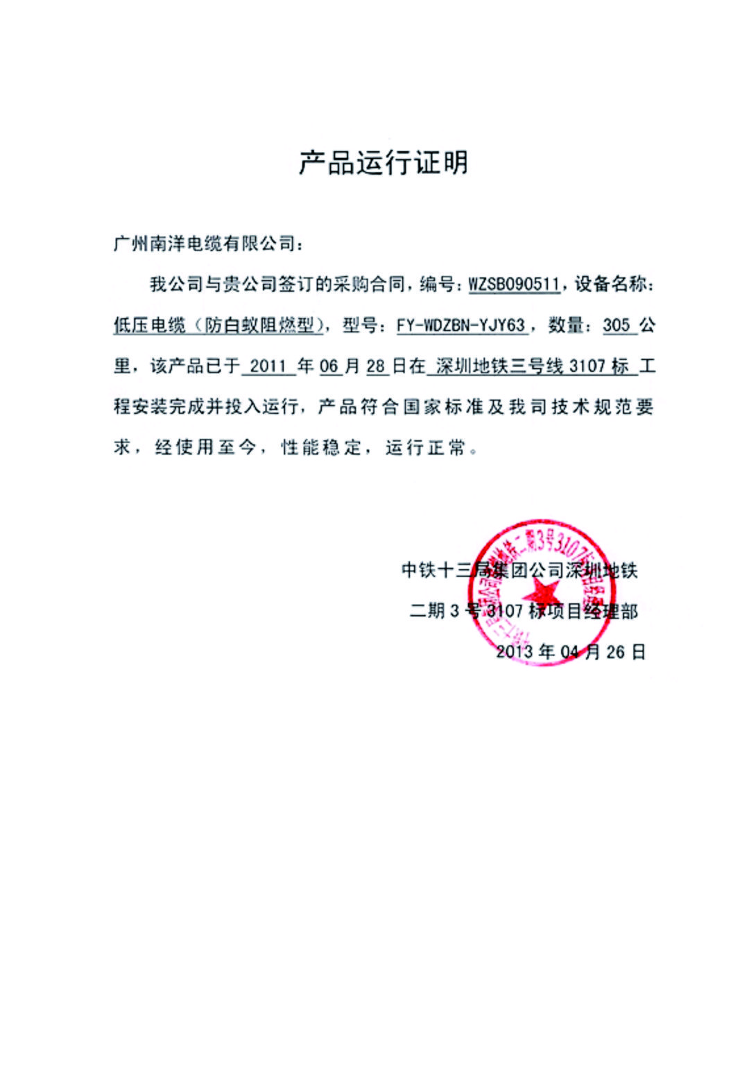 深圳地鐵(tiě)三号線3107标産(chǎn)品運行證明