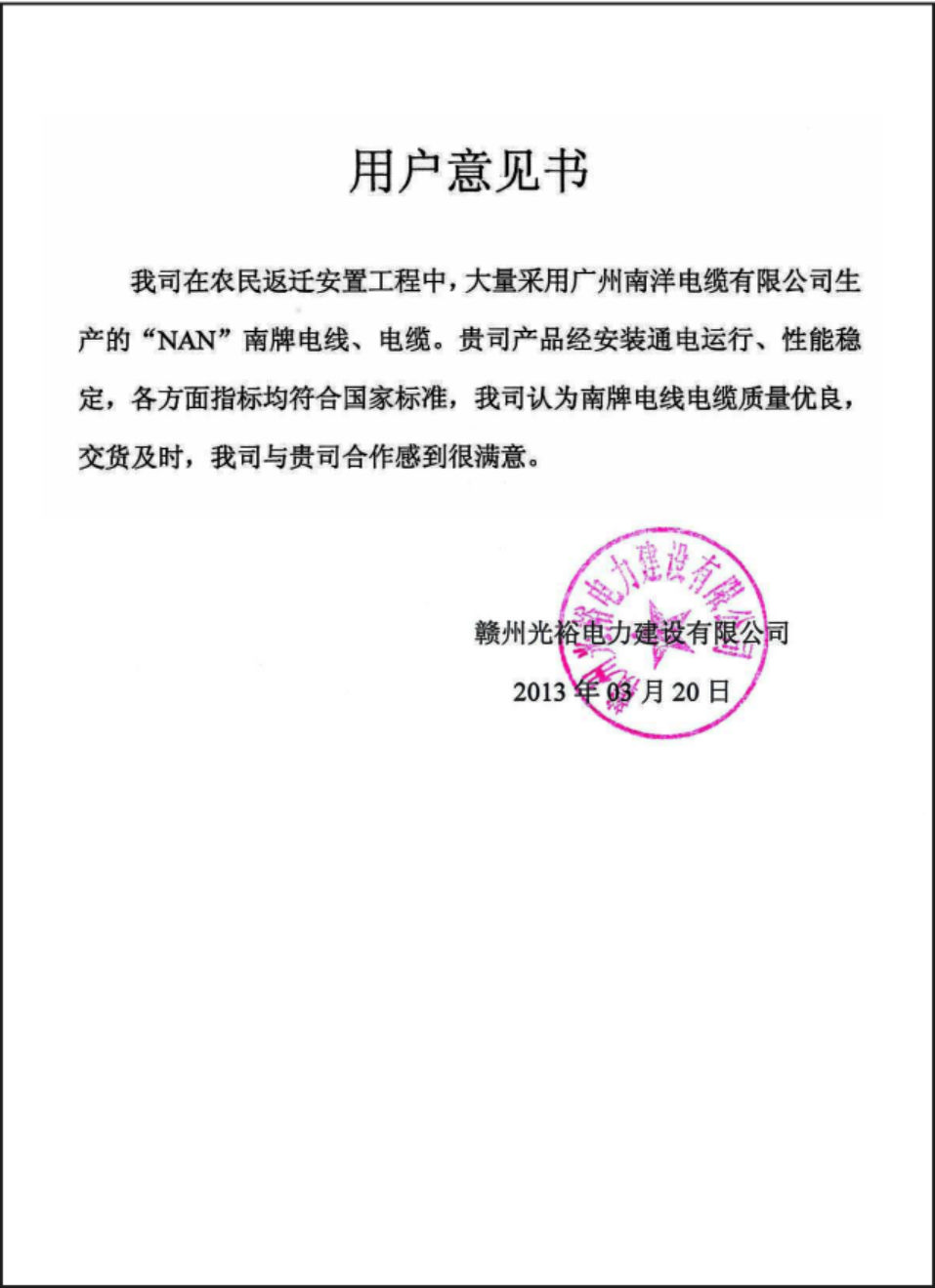 贛(gàn)州光裕電(diàn)力用戶意見書