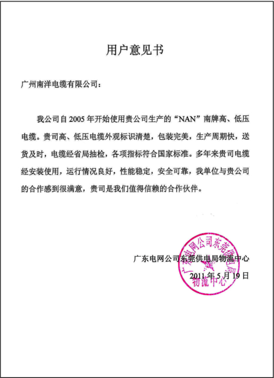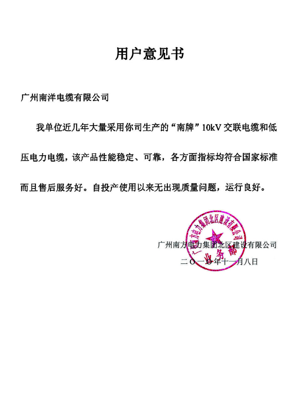 廣(guǎng)州南方電(diàn)力集團北區建設有限公司用戶意見書