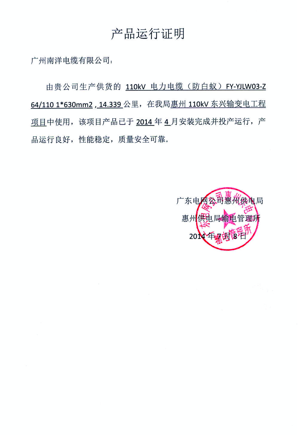 惠州110kv東興輸變(biàn)電工程項目産(chǎn)品運行證明