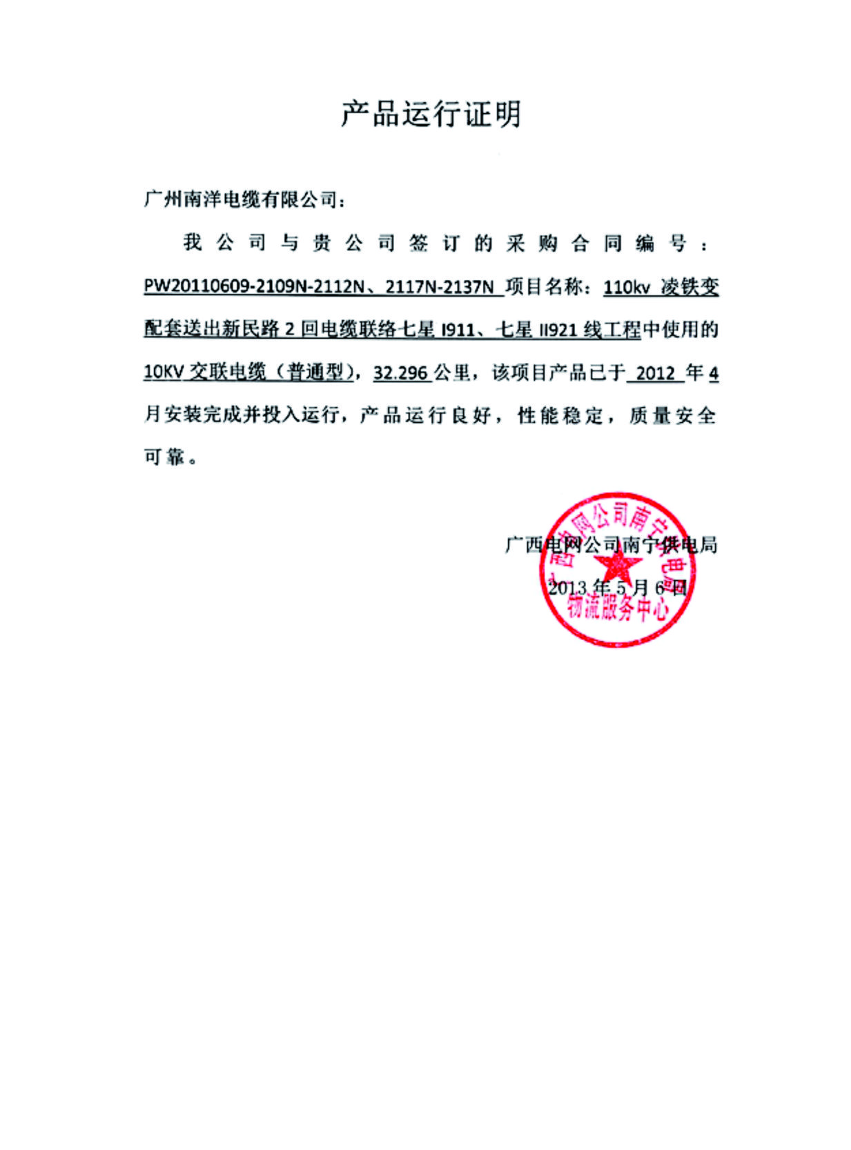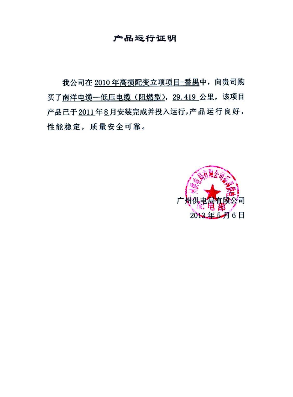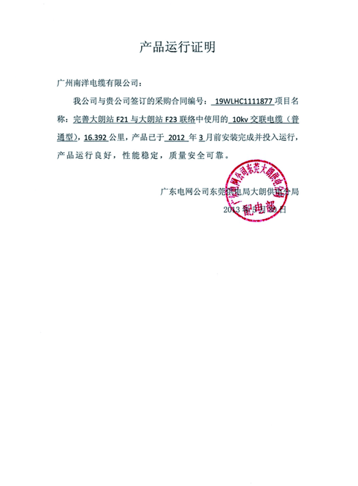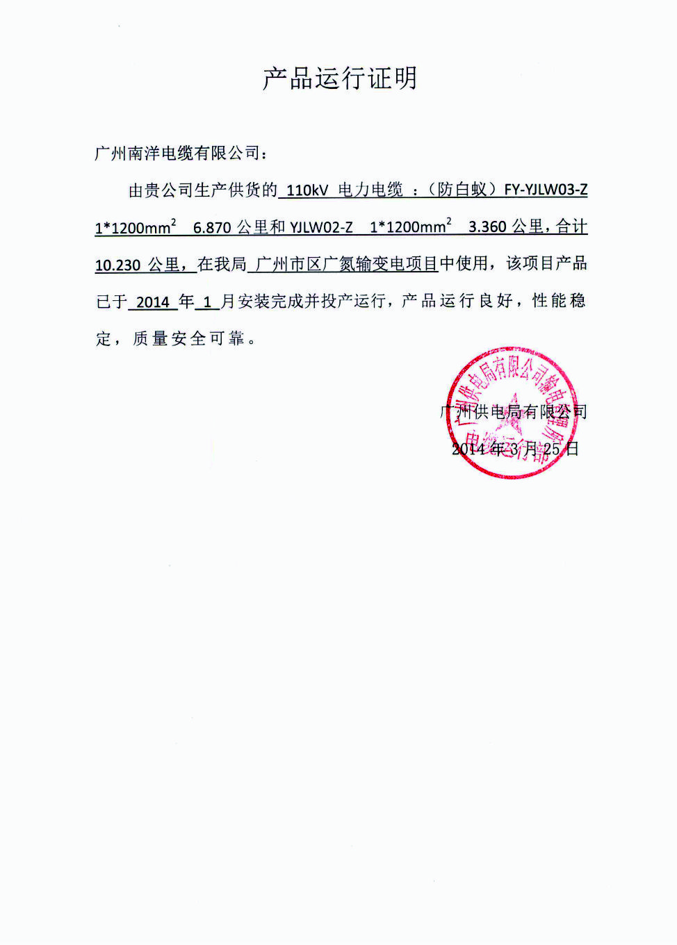 廣州市區廣氮輸變(biàn)電項目産(chǎn)品運行證明