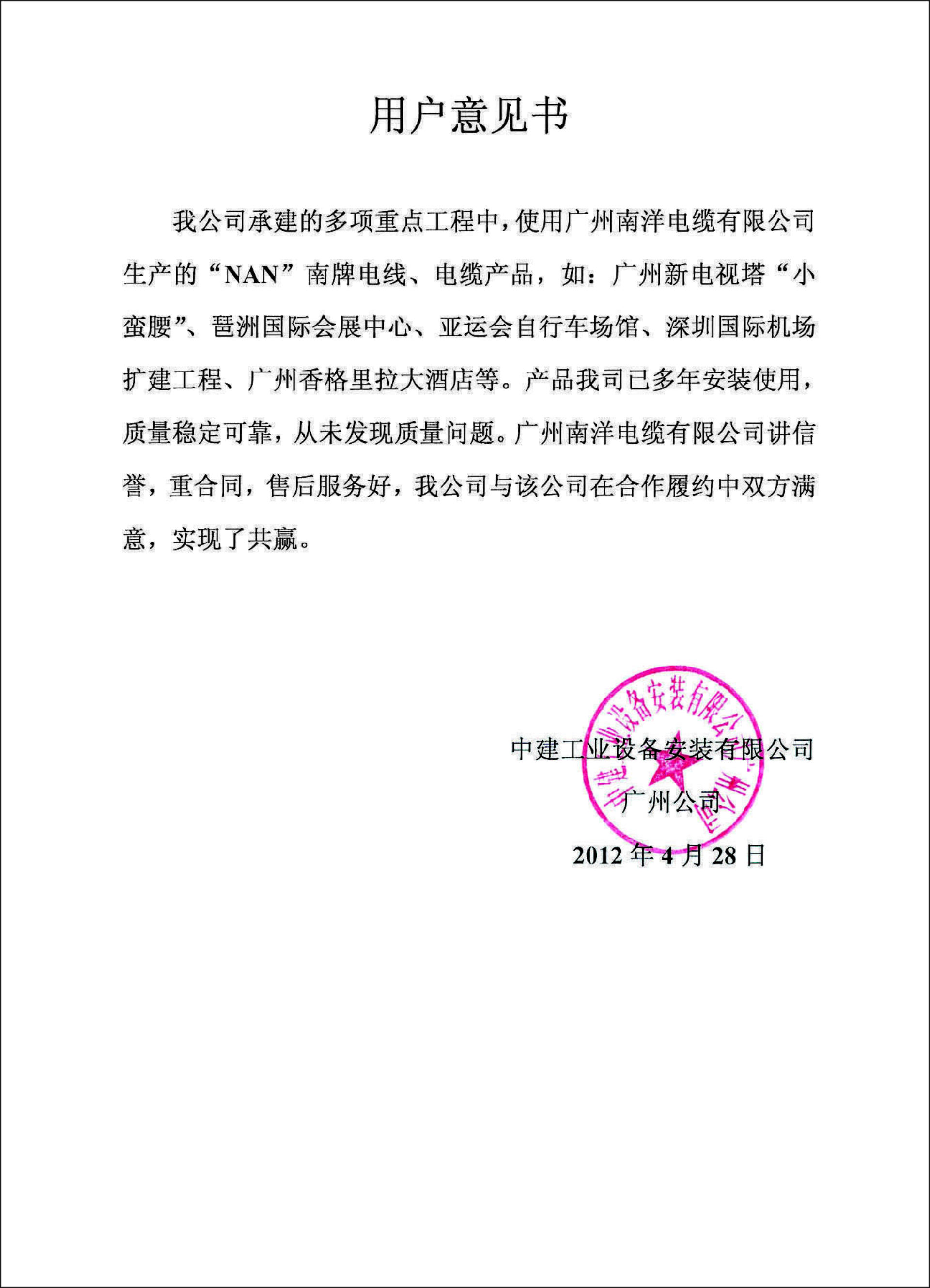 中建安裝廣(guǎng)州公司用戶(hù)意見書