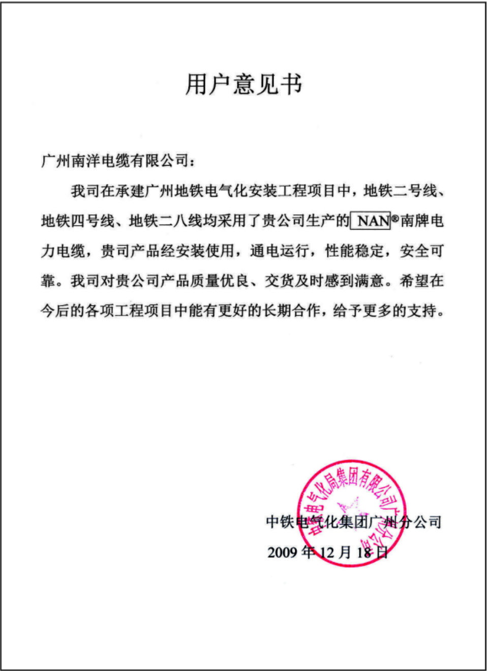 廣(guǎng)州地鐵電(diàn)氣化安裝工程項目用戶意見書