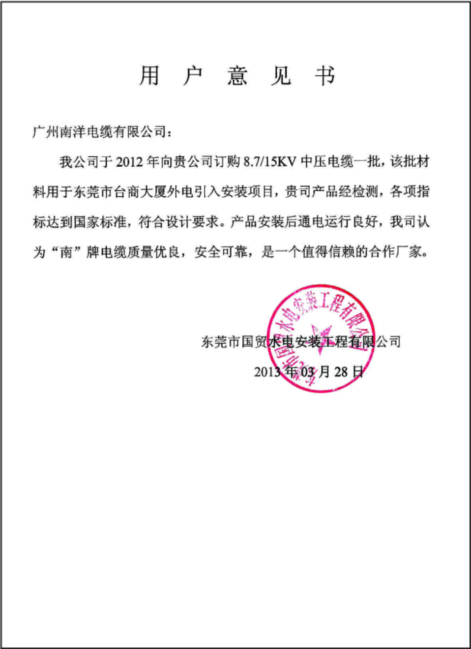 東(dōng)莞國貿水電(diàn)用戶意見書
