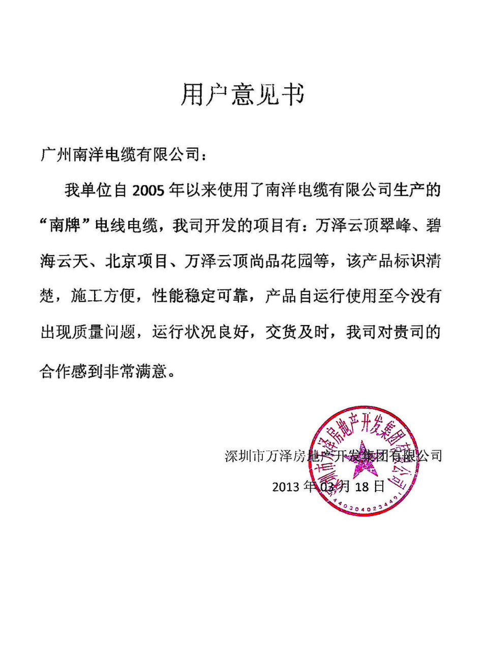 深圳市萬澤房地産(chǎn)開發(fā)集團有限公司用戶意見書