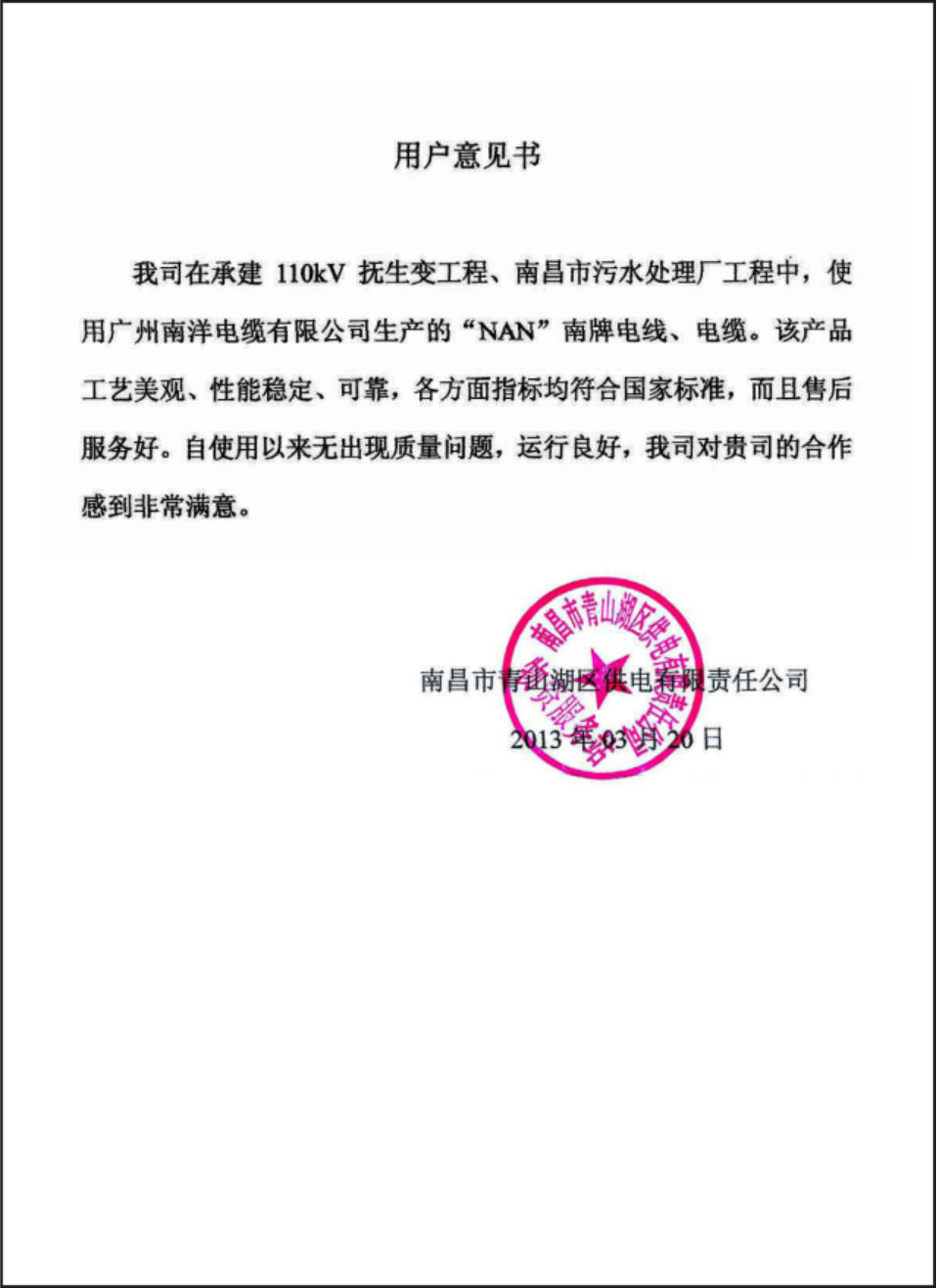 南昌市青山湖區供電(diàn)公司用戶(hù)意見書