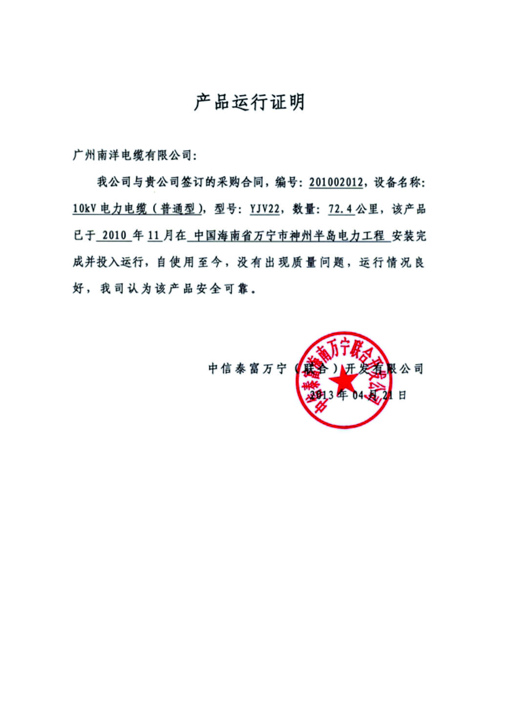 中國海南萬甯神州半島(dǎo)電力工程産(chǎn)品運行證明