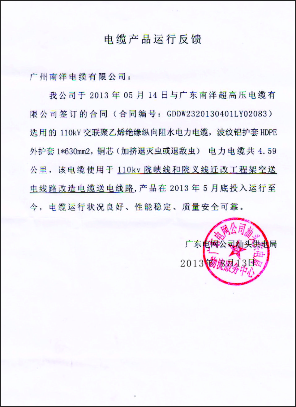 110kv院峽線和院義線遷改工程電(diàn)纜産(chǎn)品運行反饋