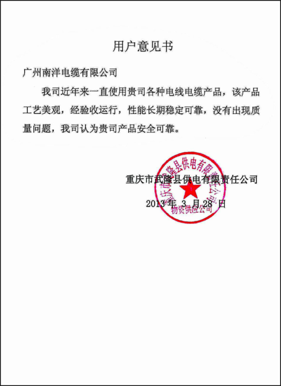 重慶武隆供電(diàn)公司用戶(hù)意見書