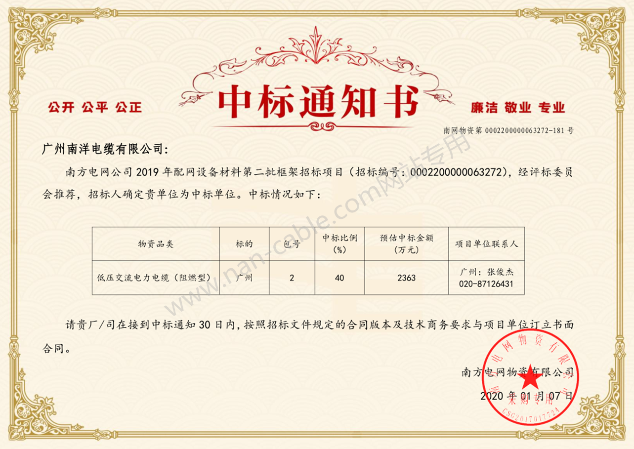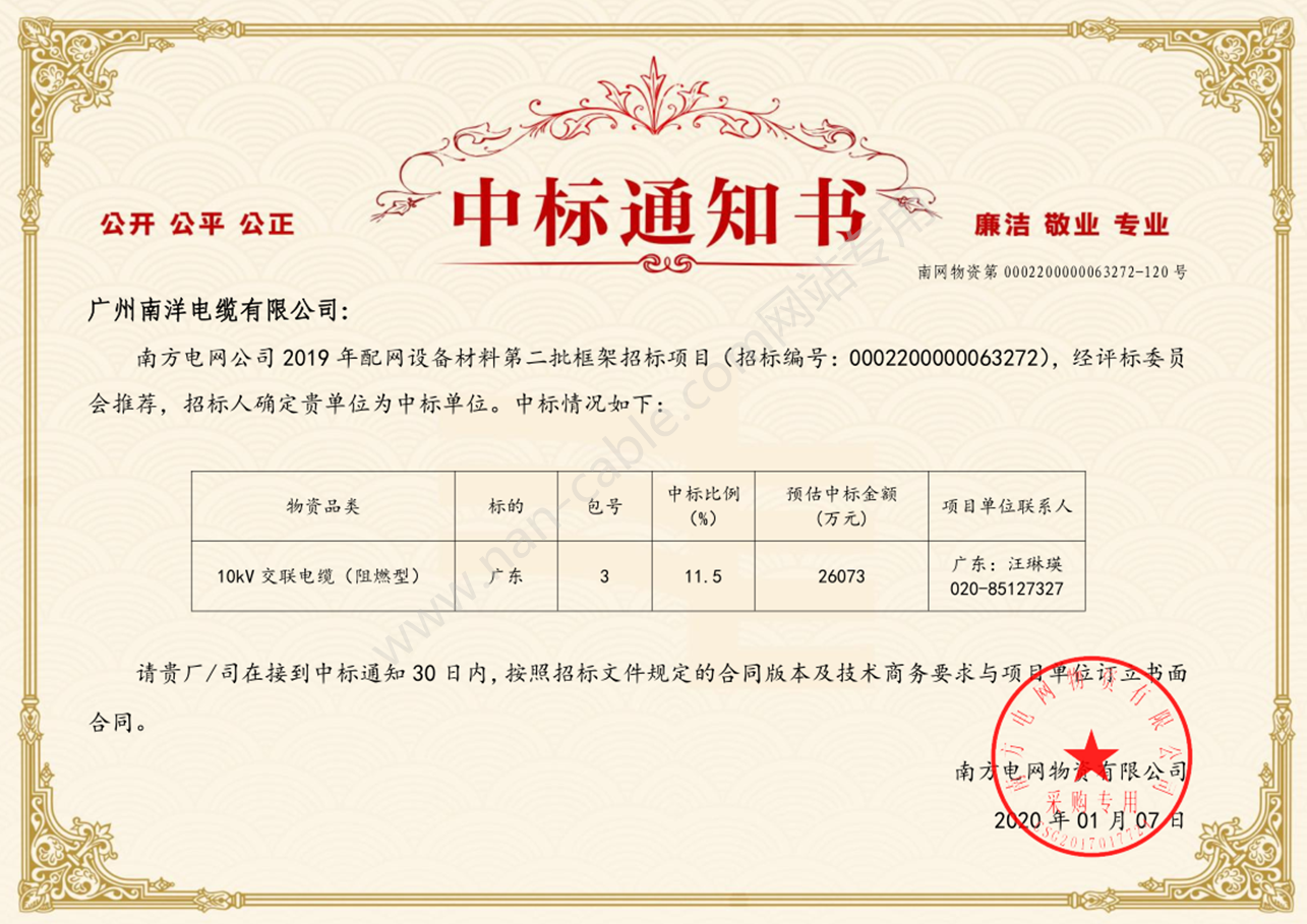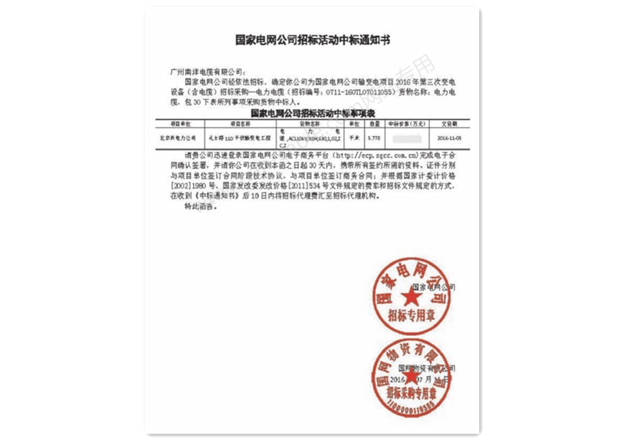 南方電(diàn)網低壓中标通知書(shū)