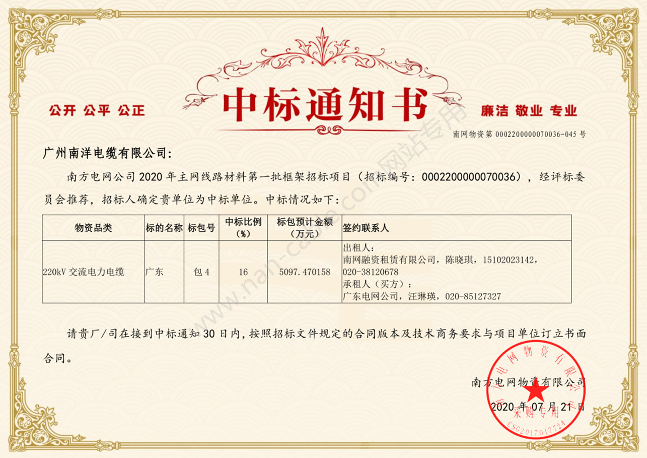 南方電(diàn)網220kV中标通知書(shū)