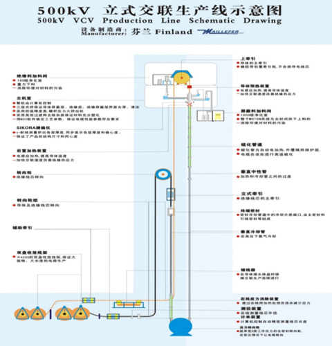 全:整套引進芬蘭麥拉菲爾(MAILLEFER)公司500kV立式交聯生産線,設備功能齊全,生産線全線由計算機自動控制。設備包括雙放裝置、放線輔助牽引、儲線器、上牽引機、重力下料裝置、前置導體預熱器、内屏擠出機(60機)、絕緣擠出機(200機)、外屏擠出機(80機)、MOTAN材料處理系統、三層共擠機頭、偏心測量儀、後置導體預熱器、計算機控制系統、交聯管道、中性管道、氣水分離器、冷卻管道、U型壓力回轉導輪、在線松弛段、下封閉、下牽引機、電纜測徑儀、雙收線裝置等。