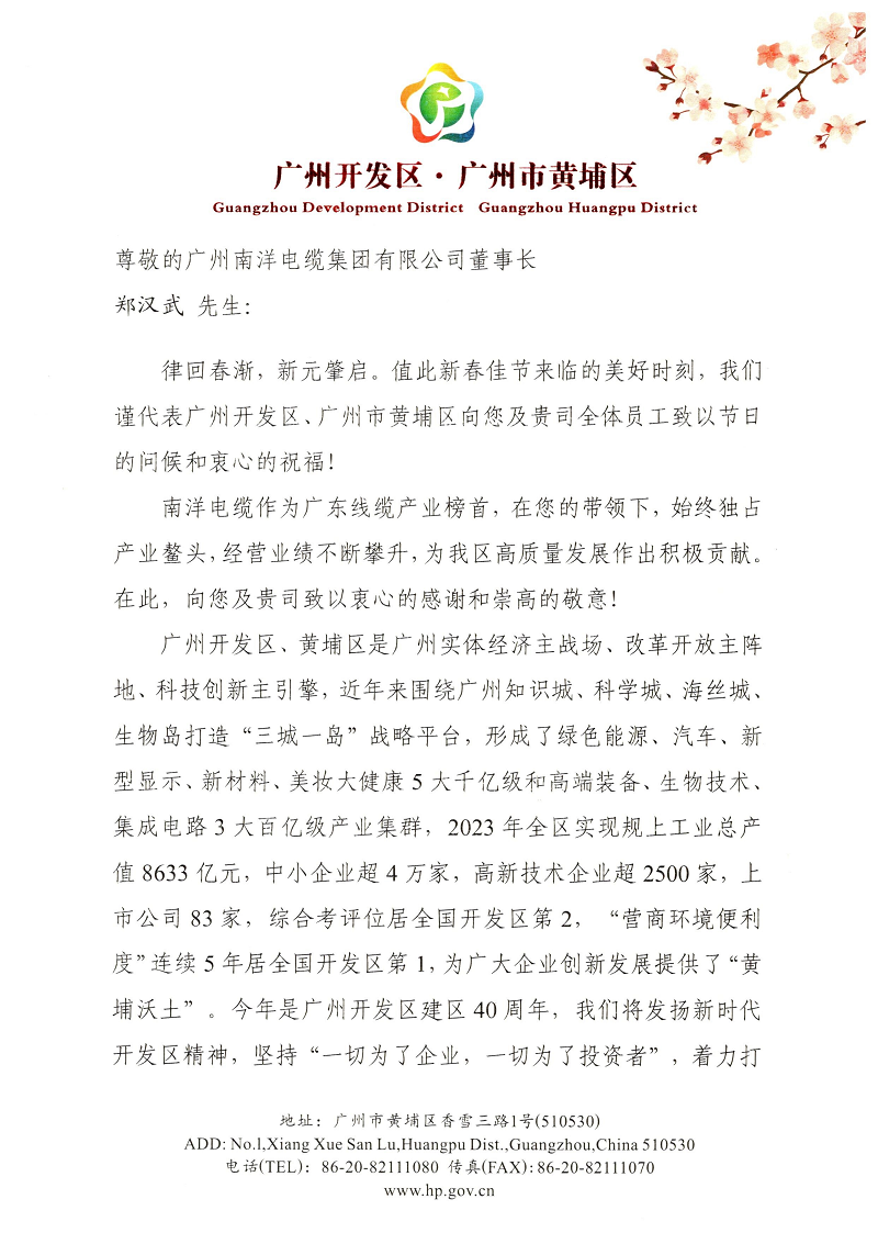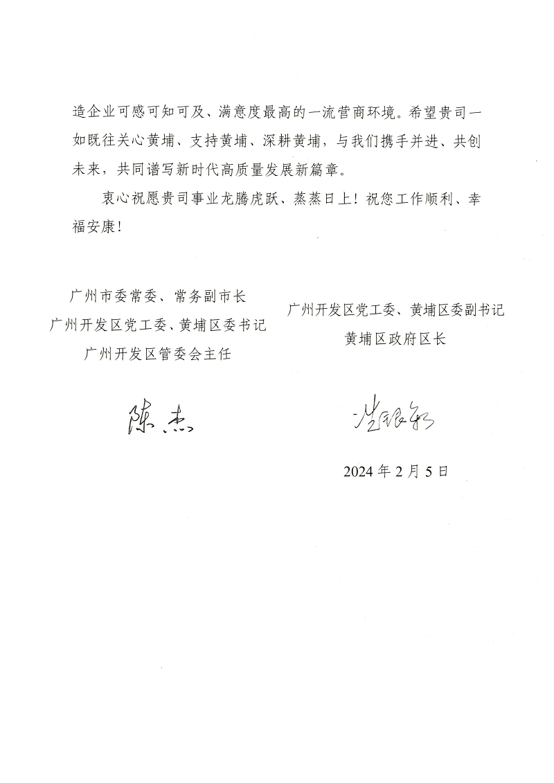 2月5日,值此新春佳節來臨之際,廣州開發區、黃埔區領導(dǎo)向我司發來節日慰問信,向鄭漢武董事長(zhǎng)及我司全體員工緻以節日的問候和衷心的祝福!