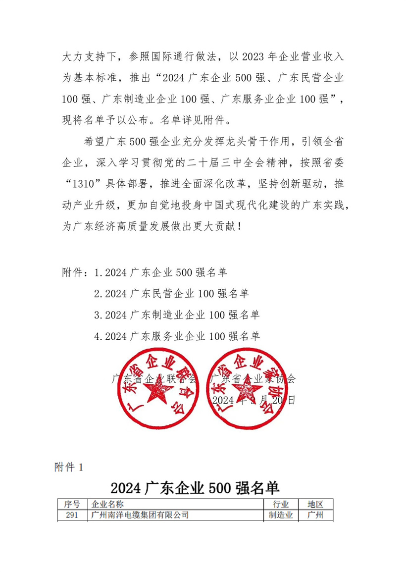 近日,由廣東省企業聯合會、廣東省企業家協會主辦(bàn)的2024廣東500強企業發展大會在廣州舉行。大會以“推進全面深化改革,建設世界一流企業”爲主題,正式向社會發布《2024廣東500強企業發展報告》,同時發布瞭(le)“2024廣東企業500強”榜單,我司榮獲“2024廣東企業500強”第291位,排名較上年提升30位。自2019年起我司已連續6年榮登“廣東企業500強”榜單,位居廣東省線纜産業入選企業第一名。