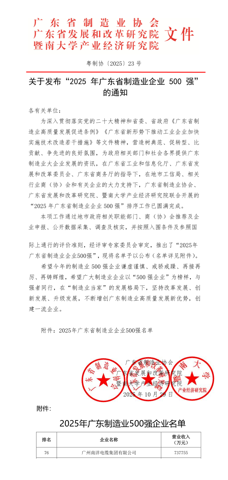 會上發布瞭2025年廣東省制造業500強企業研究報告,同時公布瞭“2025年廣東省制造業企業500強”榜單。研究報告以企業年度營業收入爲主要依據,並從上榜企業的整體規模、經營和創新能力、區域分布、行業特征和所有制類型等角度進行分析,報告顯示:2025年廣東制造業500強企業營業收入合計達到6.52萬億元,比2024年提升22.5%;淨利潤總額4203.4億元,比2024年增加25.87%。廣州南洋電纜集團2024年營業總收入73.77億多元,位居“2025年廣東省制造業企業500強”第76位, 排名較上年提升4位。今年公司還連續八年榮獲中國線纜産業最具競争力企業20強,廣東線纜産業最具競争力企業20強第一名,榮獲2025年廣東企業500強,榮獲廣東省工商聯頒發的2025廣東制造業民營企業100強。